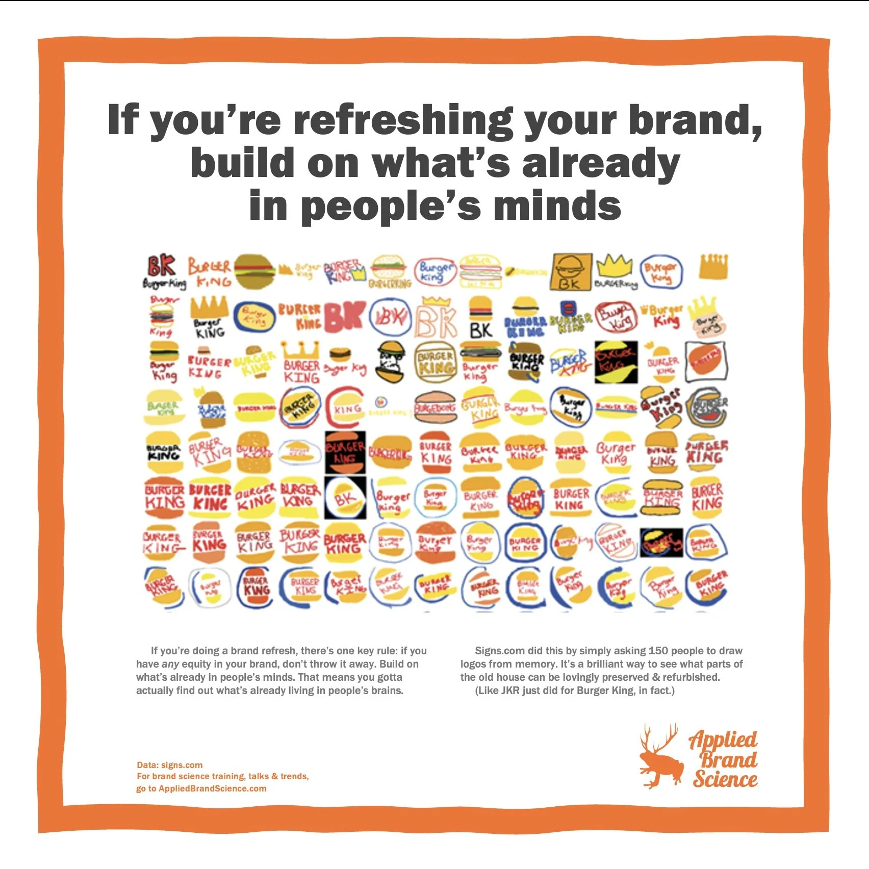F’rinstance, only 18% of people drew a good modern Burger King logo. 21% drew the previous logo (the one used from 1969-1999). And 21% drew a crown, which was a tiny feature from ‘57-’68.