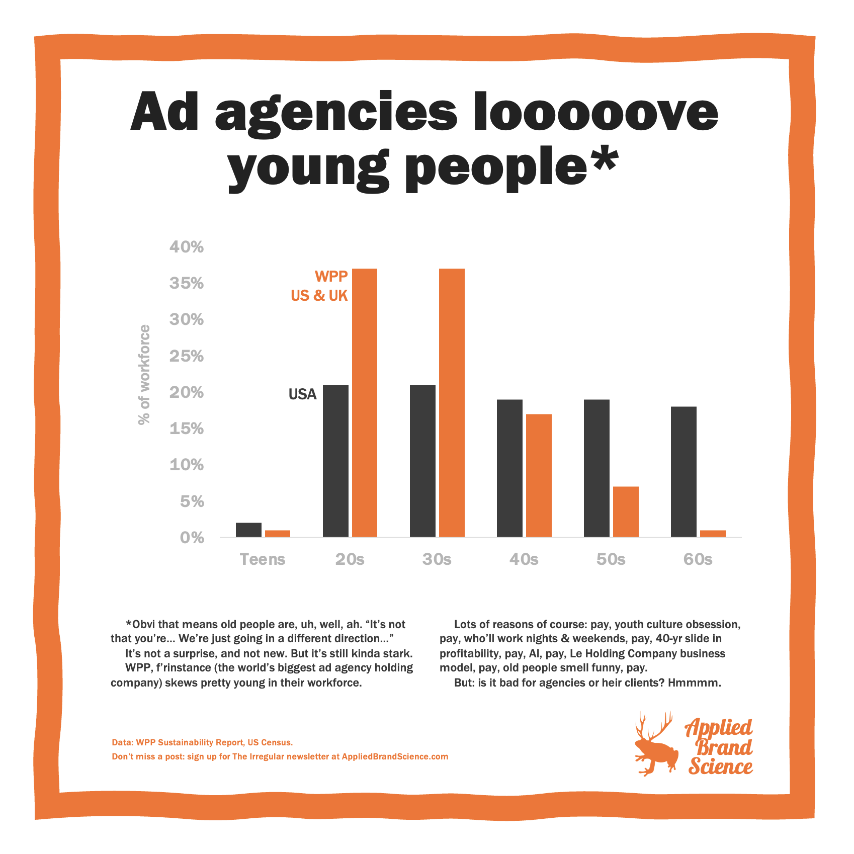 Lots of reasons of course: pay, obsession with youth culture, pay, who’s most willing to work nights & weekends for a pitch, pay, 40-yr slide in profitability for agencies, pay, AI, pay, Le Holding Company business model, pay, old people smell funny, pay.