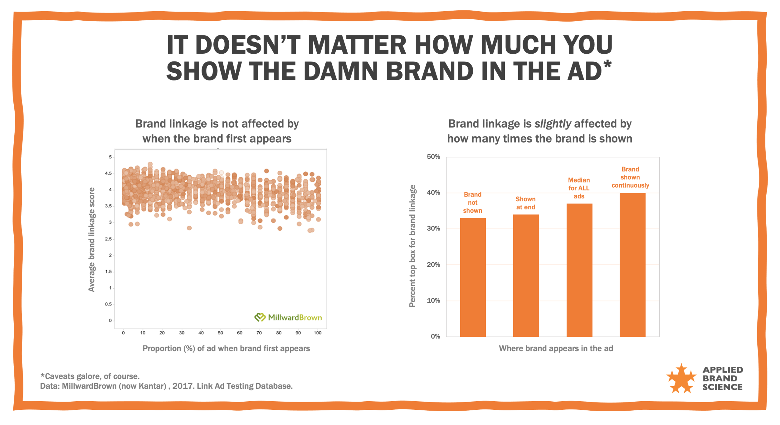 Here's some great data from Millward Brown (now Kantar) about the effect of QUANTITY and LOCATION of brand mentions in ads on brand linkage.