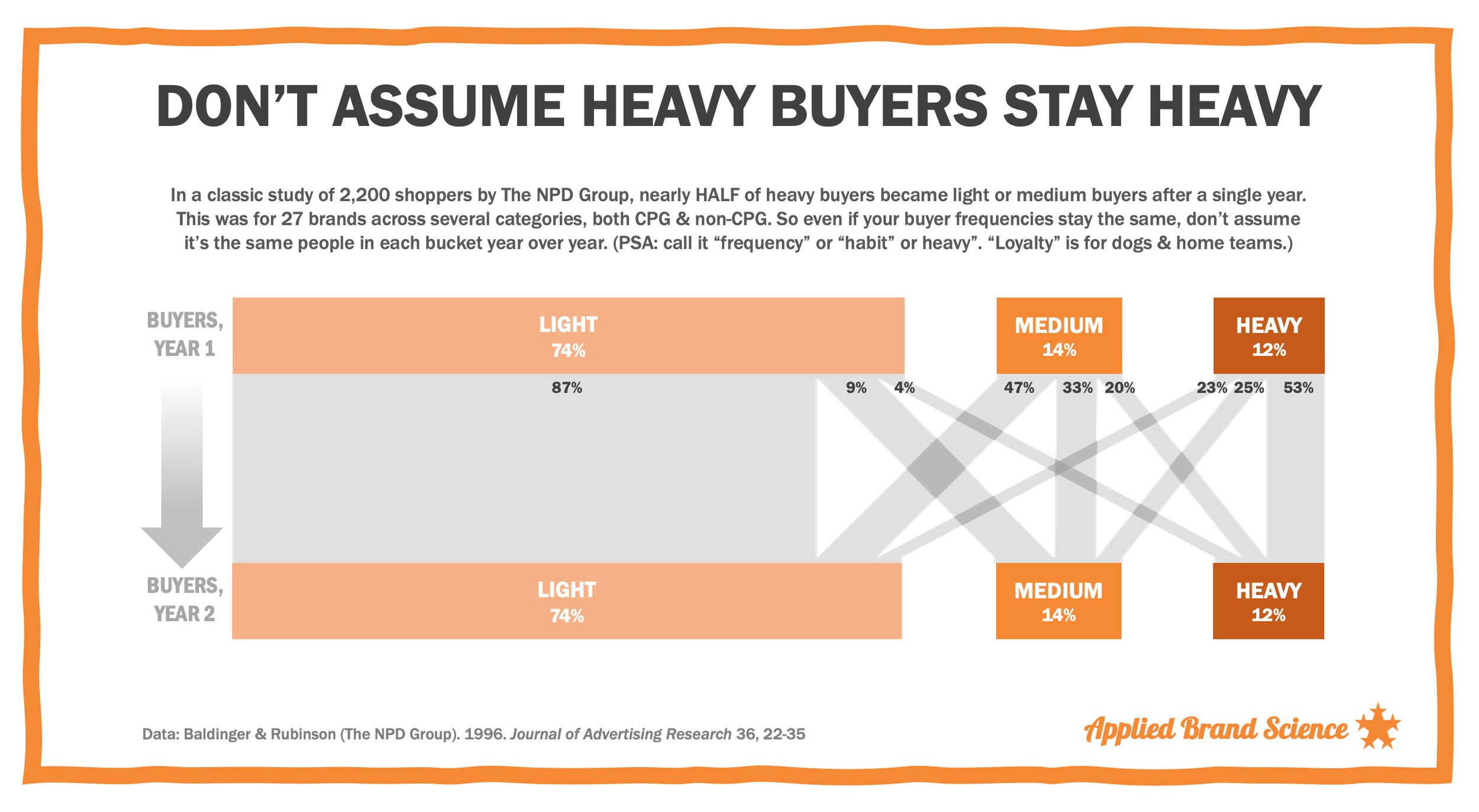 Second, they found that while 87% of light buyers stayed light, only a third of mediums stayed medium, and about HALF of heavy buyers stayed heavy.