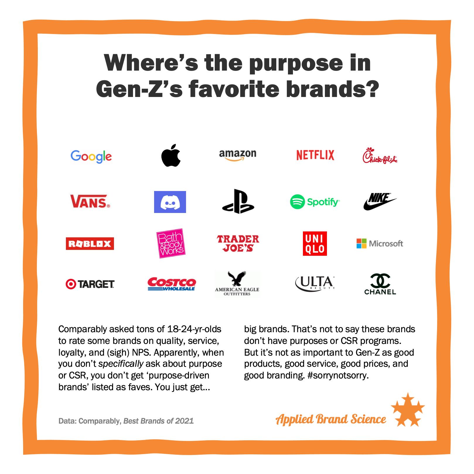 Apparently, when you don’t specifically ask about purpose or CSR, you don’t get Patagonia, Seventh Generation, or Dove.