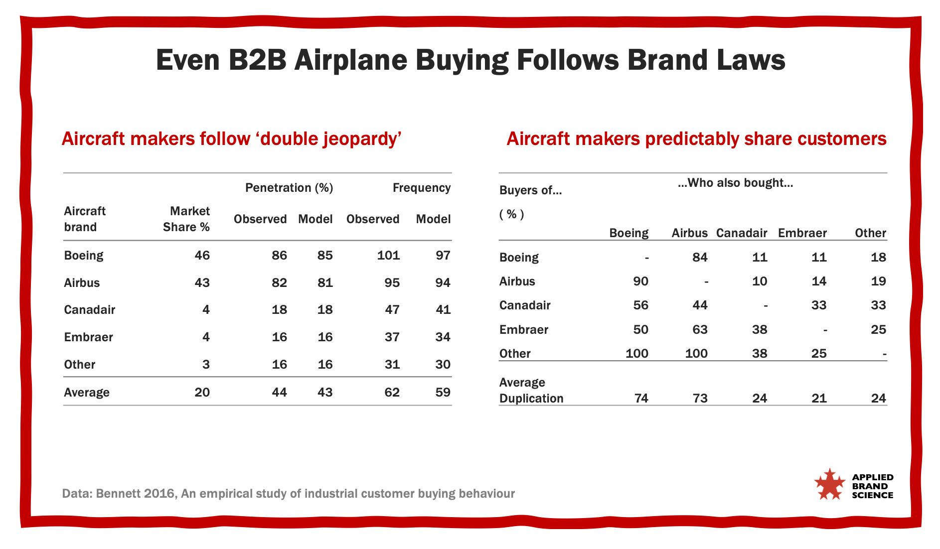 Is there some unexplained variance? Of course. Do B2B businesses differ in important ways? Yes. And these deviations from the laws can mean millions in revenue or profit. (In the case of airlines, the cross purchase patterns show that the two small brands are kind of in their own “small craft” market.)