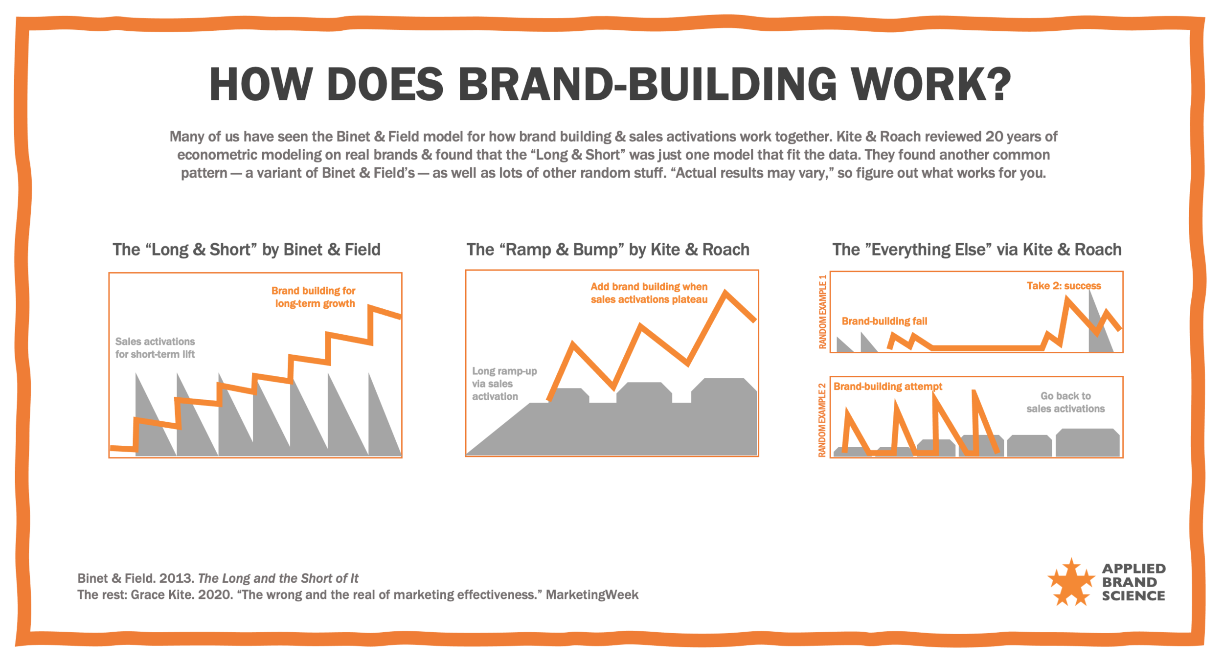 A familiar model is Les Binet & Peter Field's "Long and Short of It." Based on a review of ~1,000 IPA case studies, it says that sales activations give you short-term lift and brand-building stuff accrues more slowly to give you long-term growth.