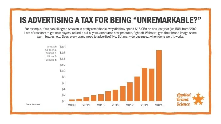 In Amazon’s case, is it working? I’d guess that such a data-driven tech company wouldn’t up their ad spend by 50% last year if it wasn’t. And brand science tells us that revenue growth tracks pretty tightly with share of voice.