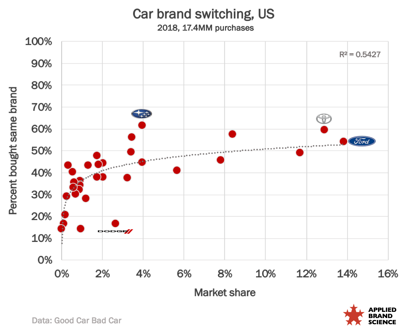 Some brands do have more churn (Dodge) or repeat (Subaru) than they should given their market share. But it's somewhat predictable.