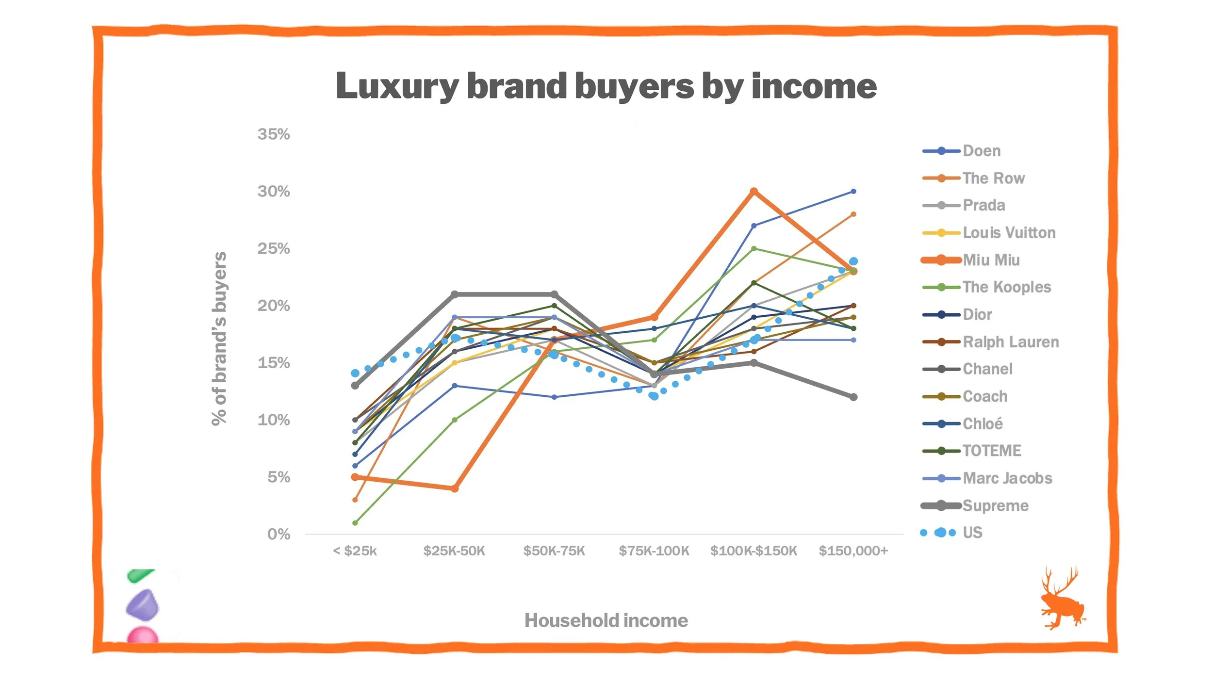 Brands known to be more expensive (like Miu Miu, the orange line) are bought by wealthier households than brands known to be more ‘street’ (like Supreme, the gray line).