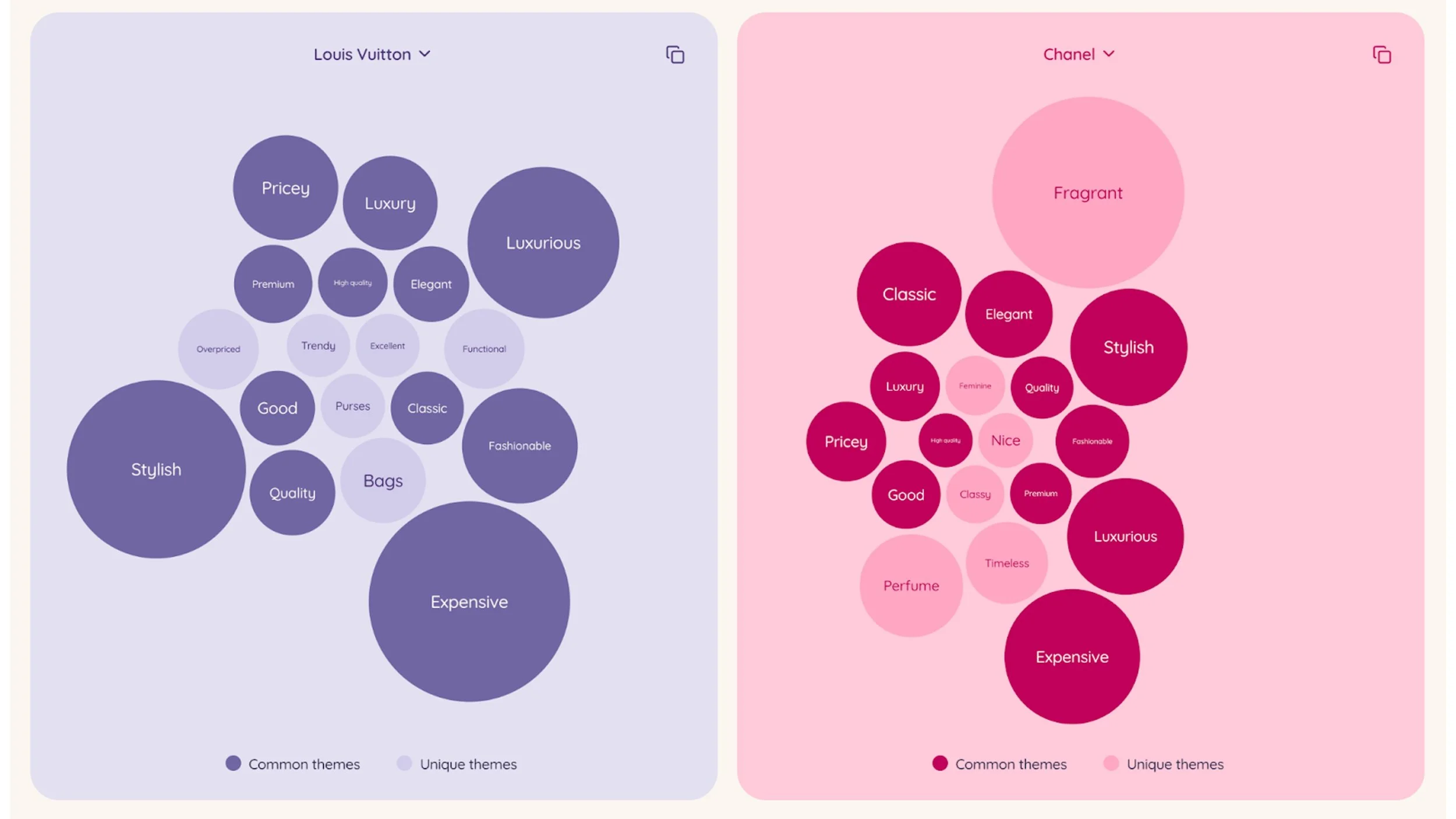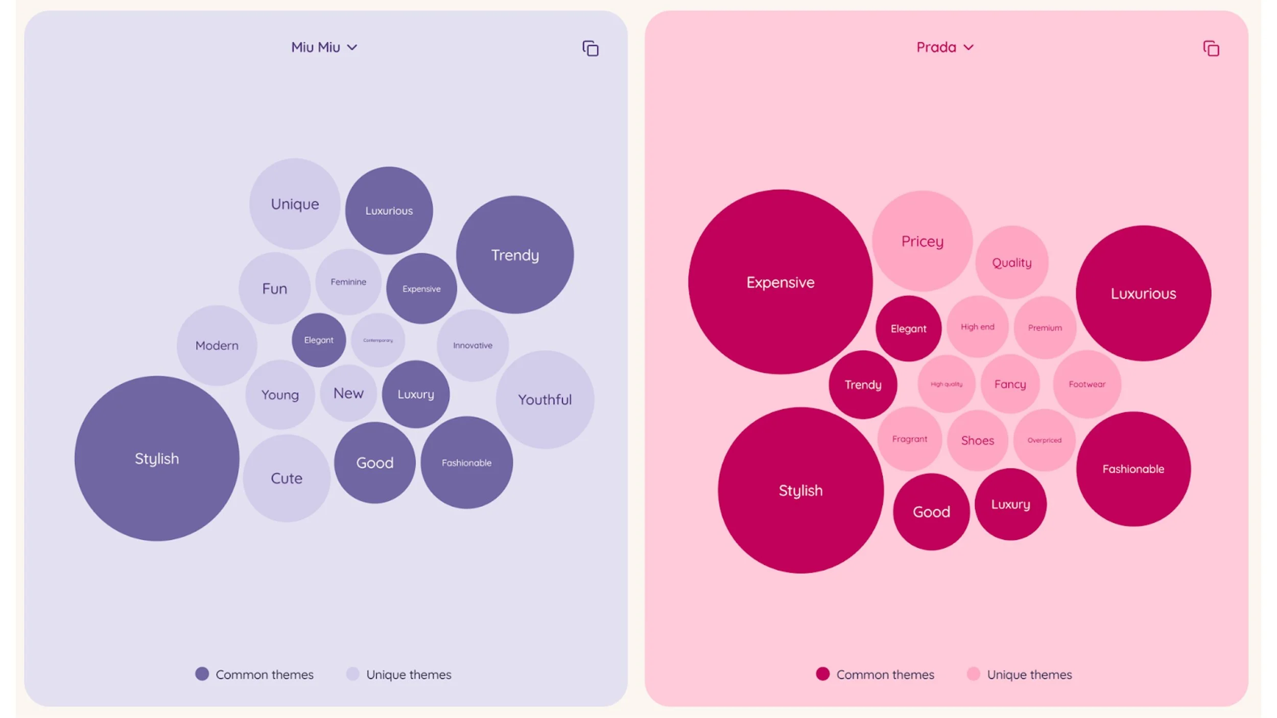 Below are pairwise comparisons for a few luxury brands. Each image shows what the brands have in common (dark circles) and how they differ (light circles). Circle size shows how often that attribute came up for the brand.