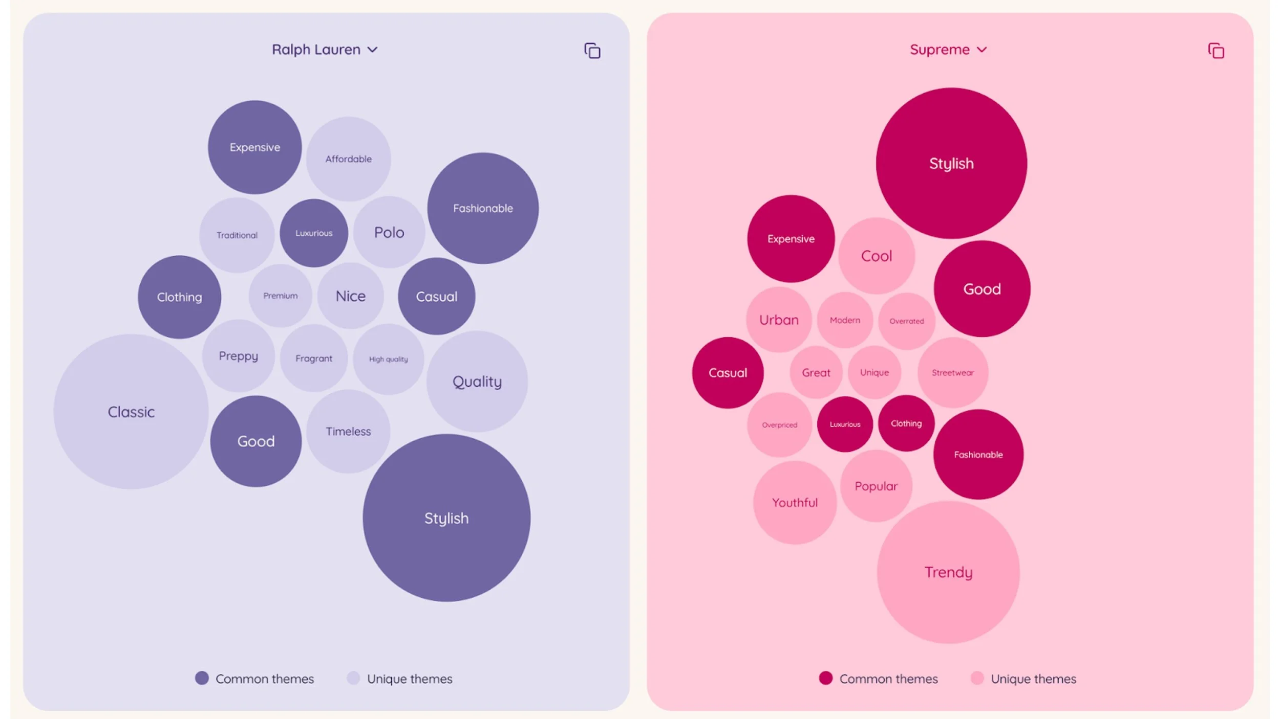 Here’s another comparison, between Ralph Lauren (1967) & Supreme (1994). This time, we’d assume they’d have more differences. And it’s true. They are both seen as stylish, expensive, fashionable and casual. But Ralph Lauren is classic, timeless, polo & preppy; whereas Supreme is (very) trendy, youthful, urban, cool, and streetwear. These images check out intuitively too. Again, both camps would have support.