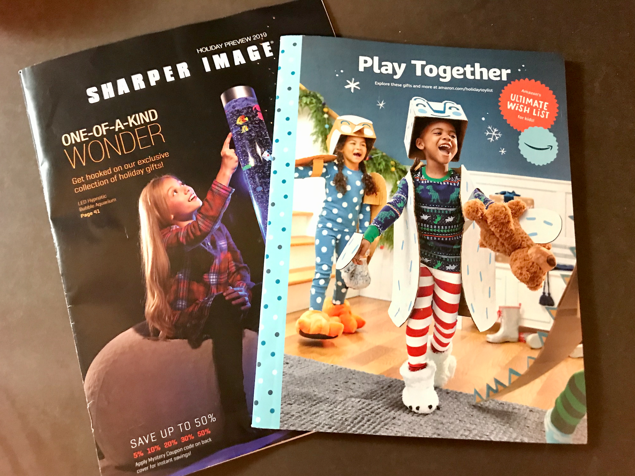 What a pairing! The Sharper Image, still going since 1977, when Happy Days dominated the ratings. And… Amazon’s holiday toy catalog.