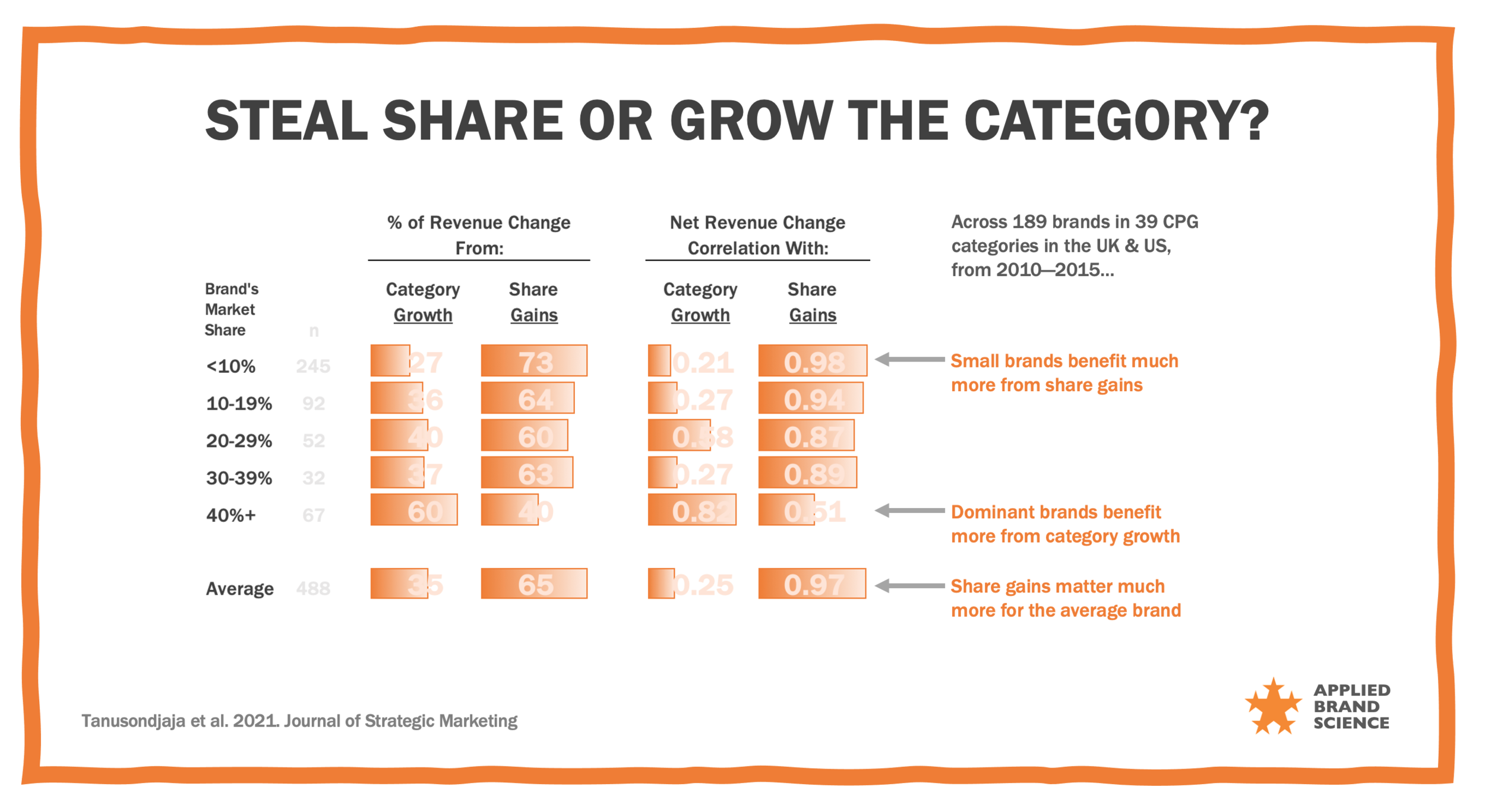 For tiny brands (<10% share), even more revenue growth came from stealing share (73%).
