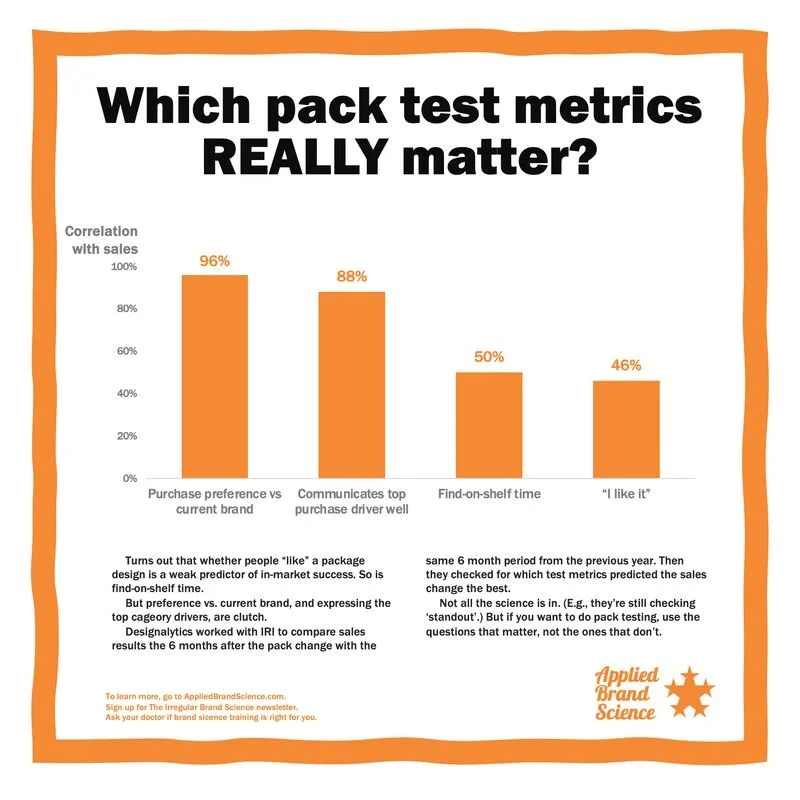 Designalytics has been doing packaging research for a looooong time. Recently, they did some research with IRI to see which test metrics predict in-market results for 52 pack redesigns across a range of CPG categories.