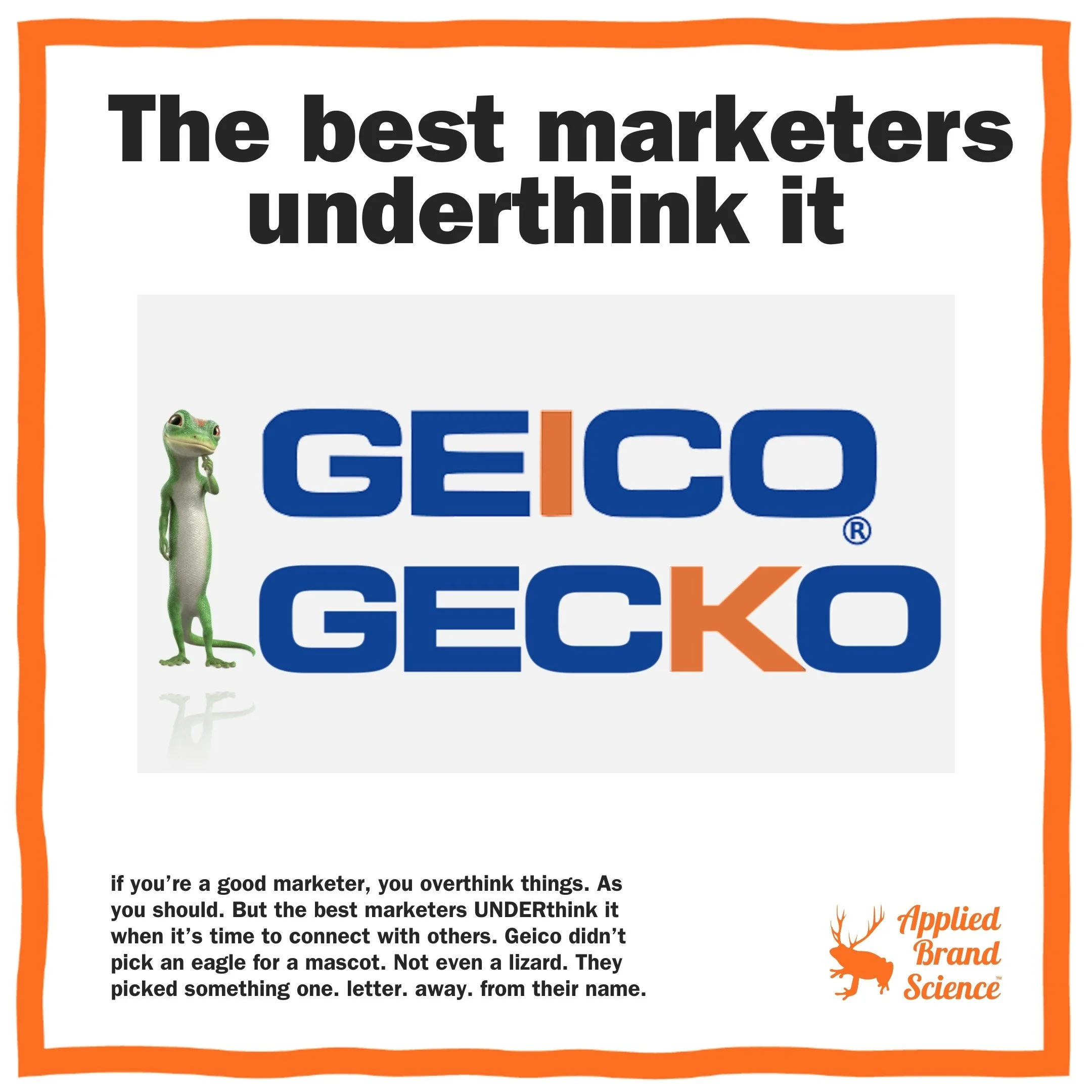 And then they gave it a Cockney accent. Why? Again, it’s nothing to do with insurance and EVERYthing to do with our brains. We have leaky, lazy brains, and GEICO needed something sticky to get their brand stuck to our brains. What’s stickier than a gecko for GEICO? How about one with a Cockney accent? THAT’S underthinking it.