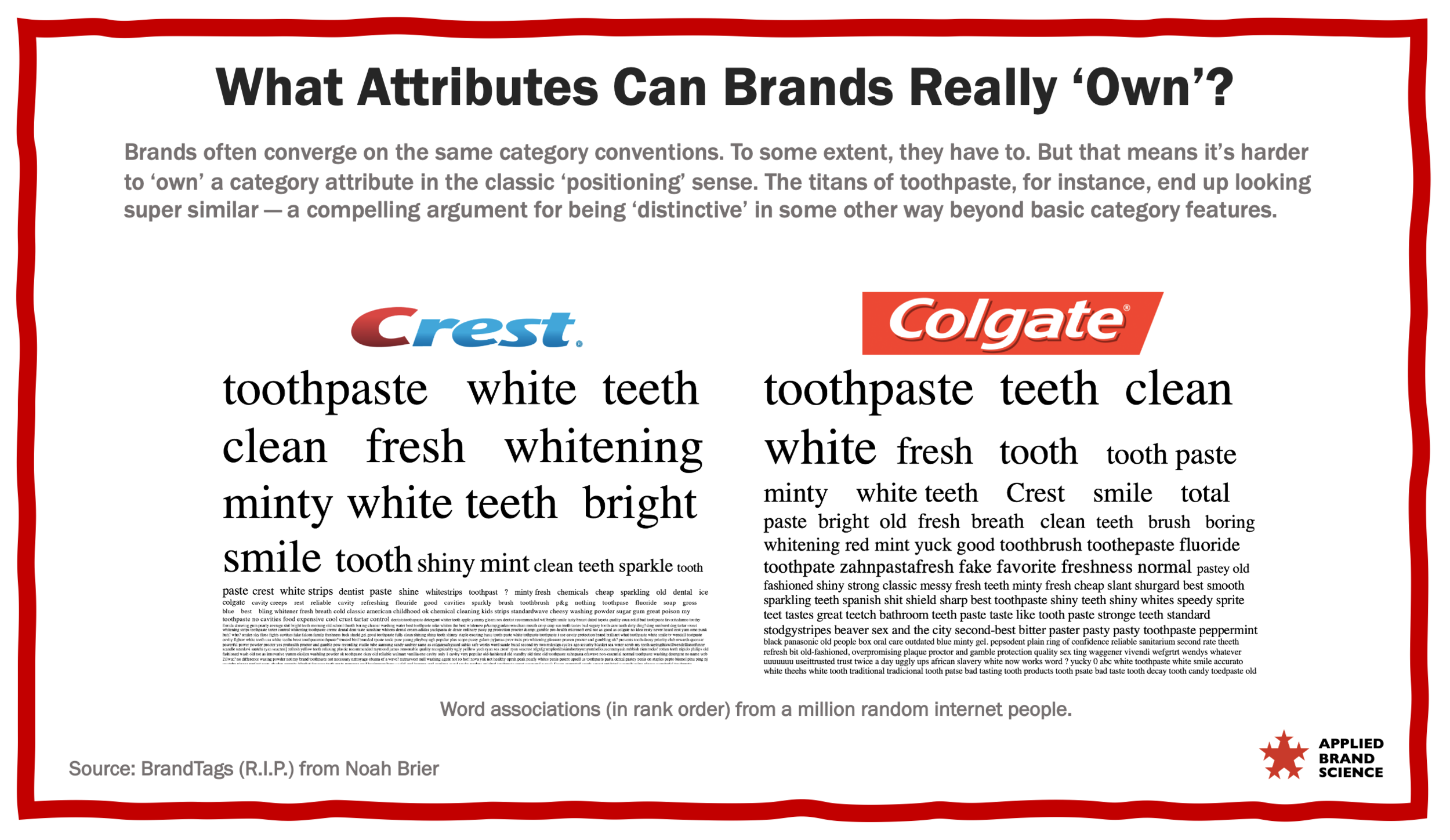 You can see it when comparing Colgate & Crest from Noah Brier's old Brand Tags site, which was a little online word association quiz from 10 yrs ago. He’d show a logo; you’d type a word. Not super-scientific, but he gathered millions of responses.
