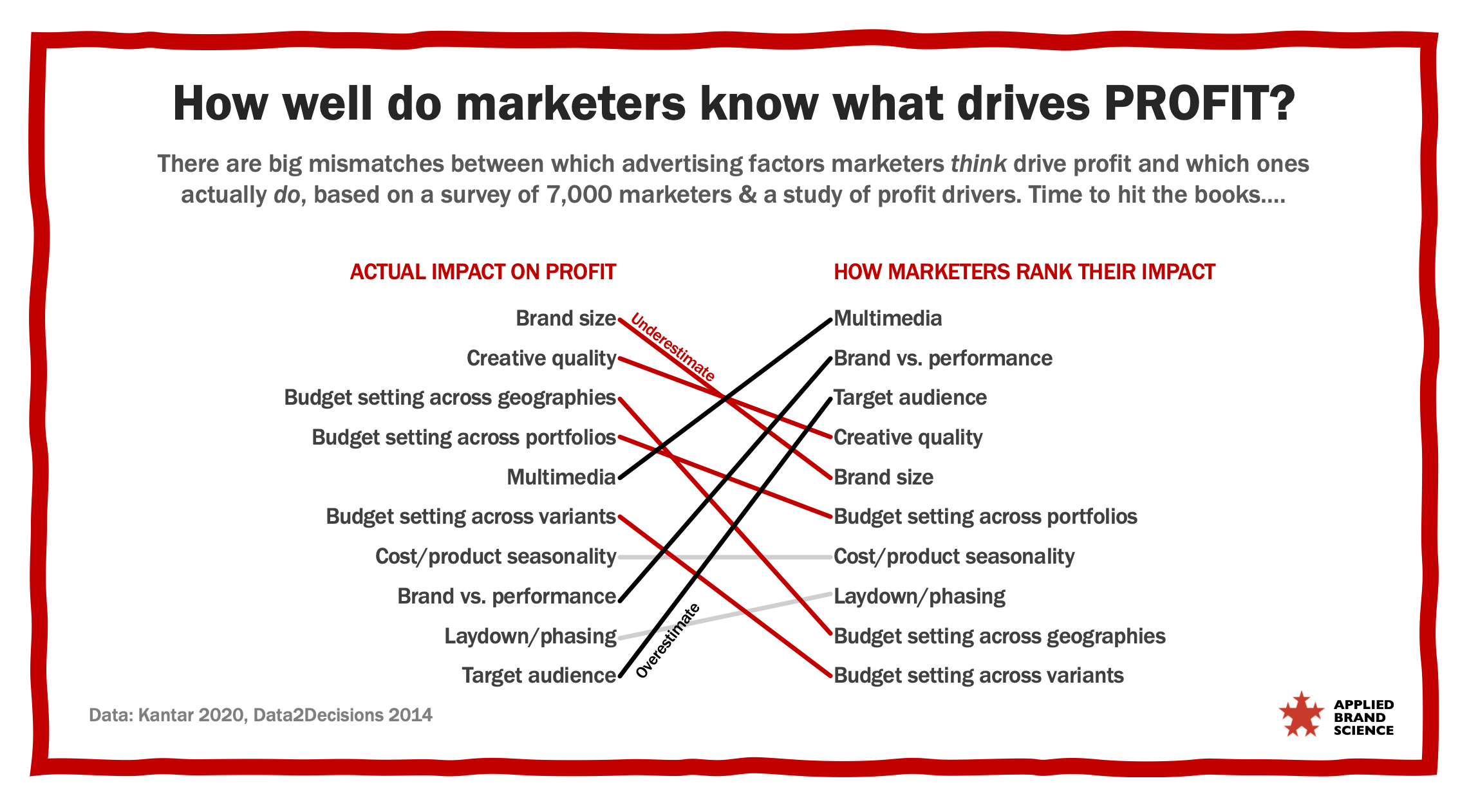 Kantar surveyed 7,000 marketers and asked them to rank how 10 different factors impact the profitability of their advertising. Then they compared that to a 2014 study from Data2Decisions of what advertising factors actually do.