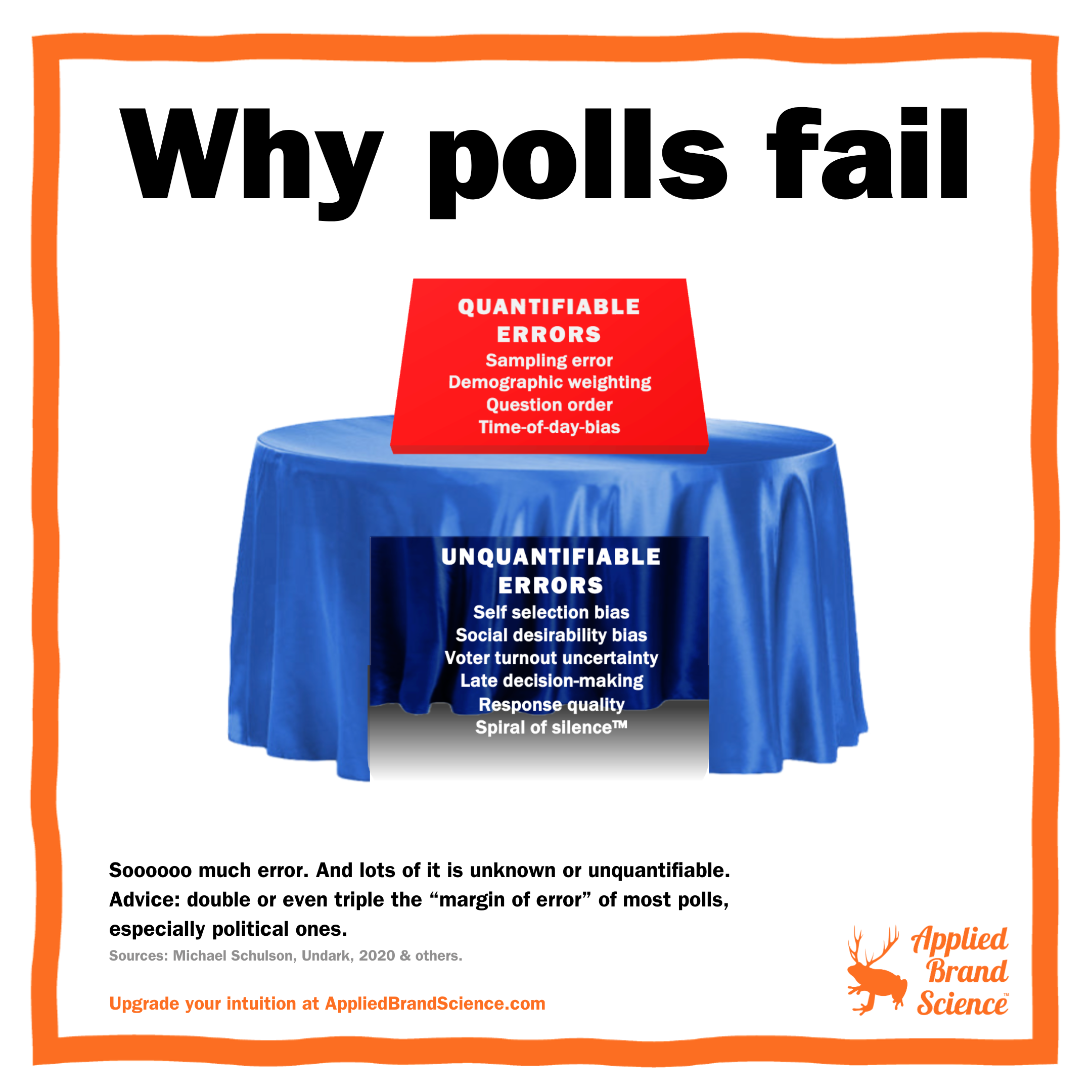 🍊 For election polls, we should probably DOUBLE or TRIPLE the Margin of Error to account for, uh, stuff we can’t account for. 🤪